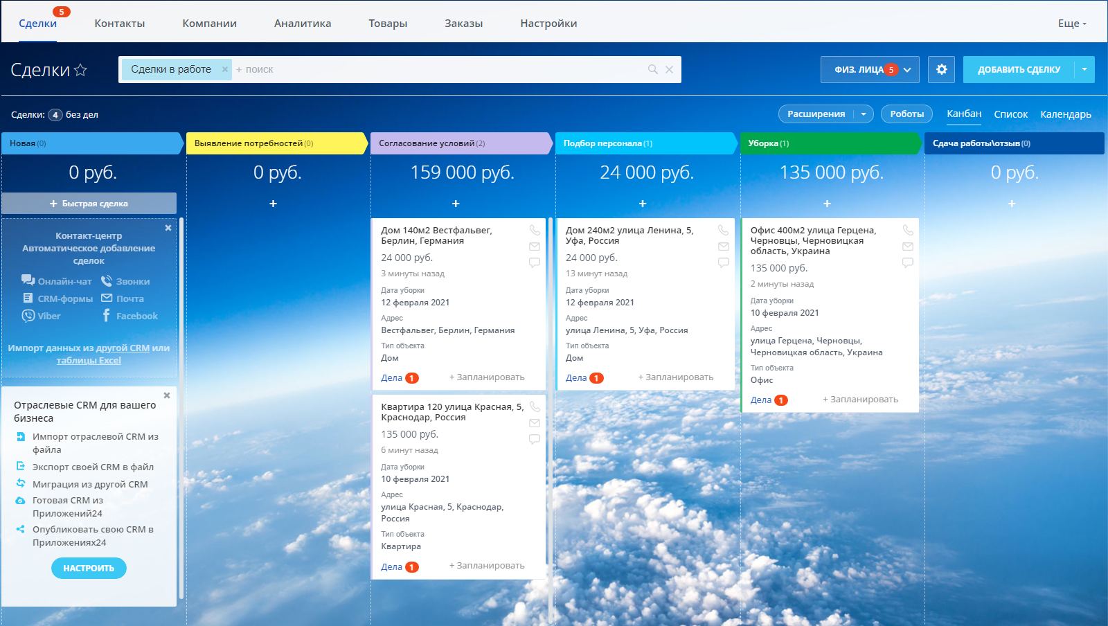 Готовая CRM для клининговых компаний, подойдет для тех, кто только начал знакомство с Битрикс24. Настроенные воронки продаж, автоматизация робот и все необходимые поля в карточках сделок.