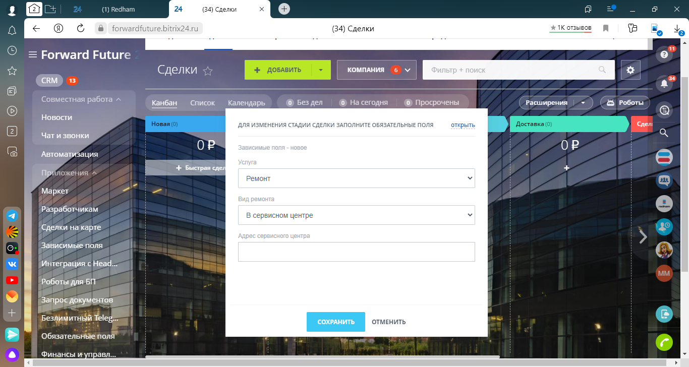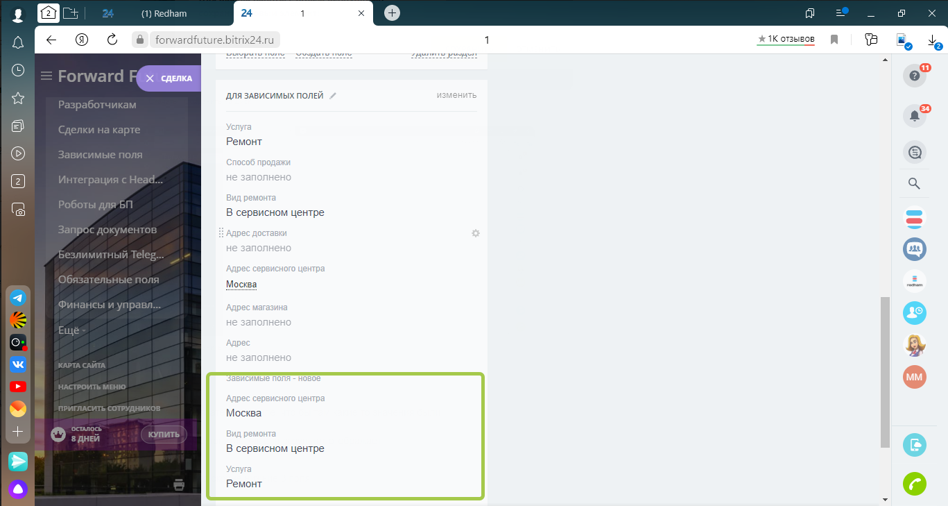 Вы можете указать, при выборе какого из значений какое дополнительное поле должно быть запрошено у менеджера. Количество полей не ограничено, нужно выбрать только первое поле, с которого начинается заполнение.