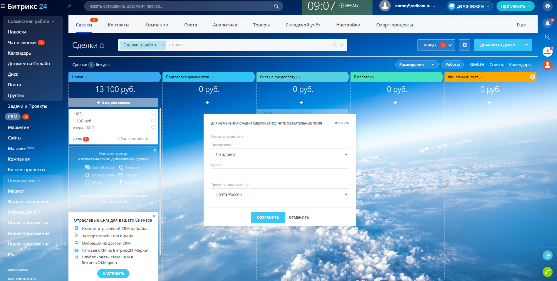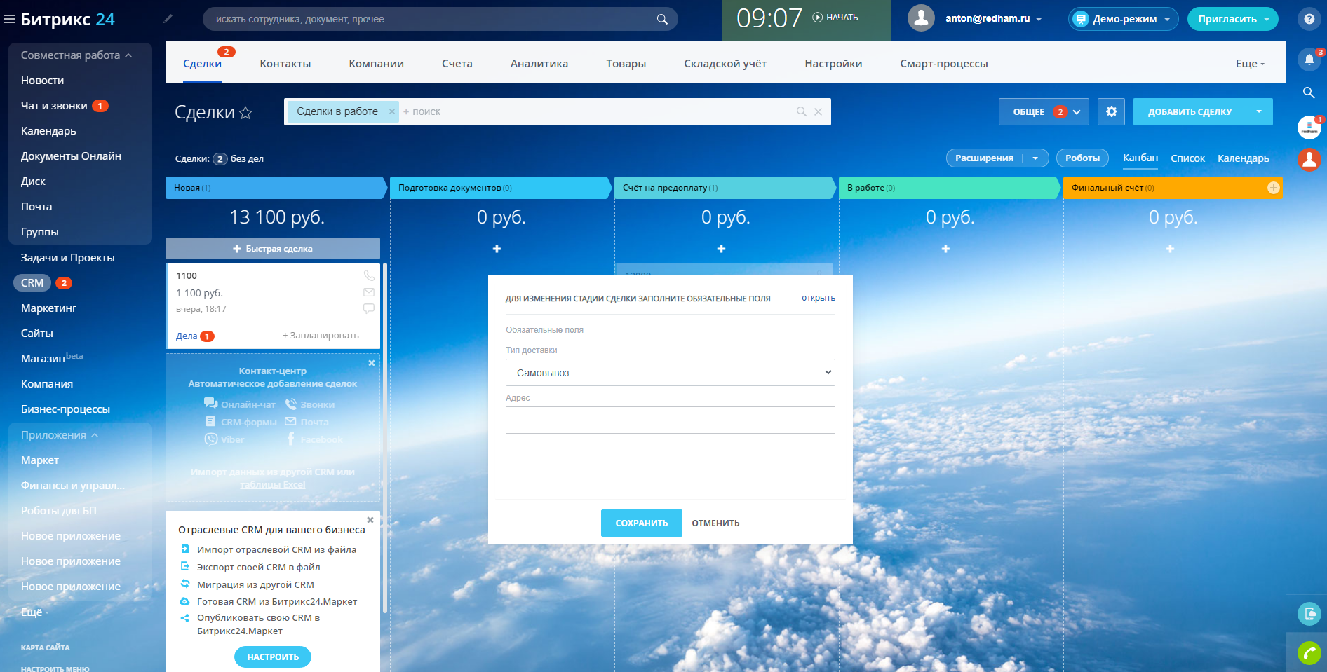 Приложение позволяет запрашивать у менеджера обязательные поля на любой из стадий по условию. Условием является любое пользовательское поле в карточке сделки.