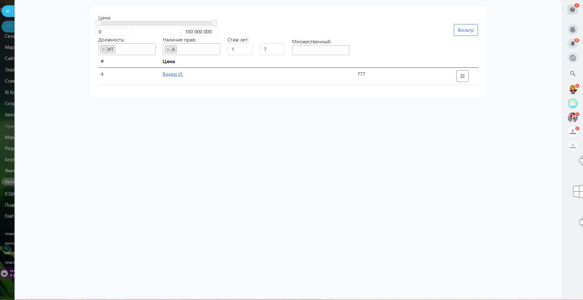 Таким образом, менеджер, просто заполнив поля стаж, город и навыки, переходит на вкладку "Подбор", и сразу ему отображаются кандидаты из нужных ему воронок с необходимыми навыками. Таким образом, процесс найма занимает минуты.
