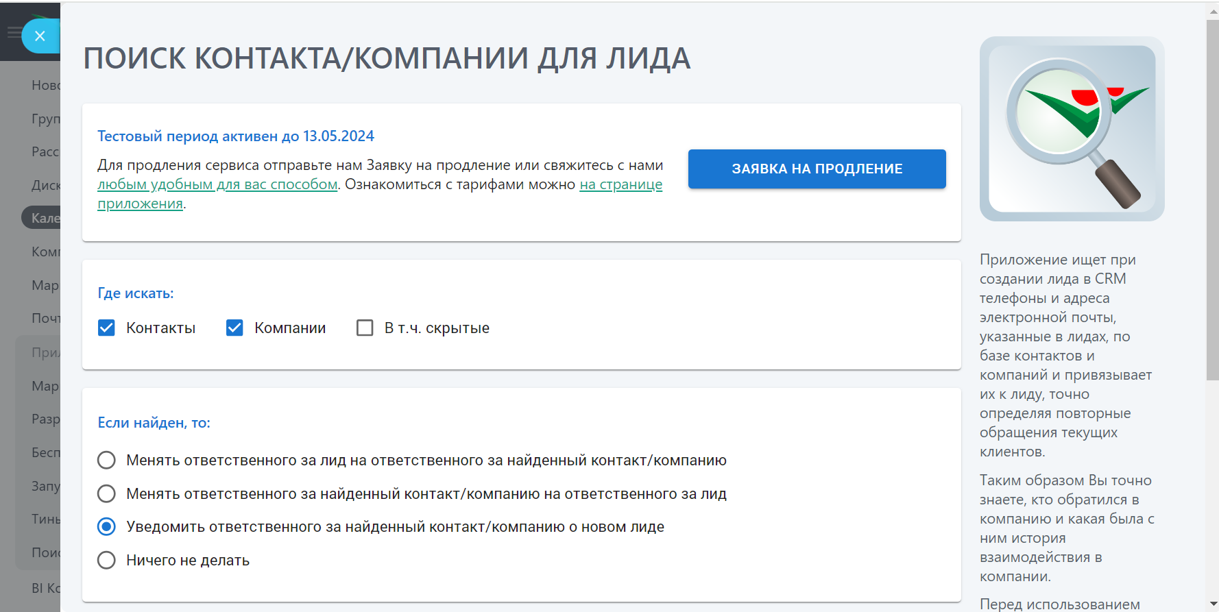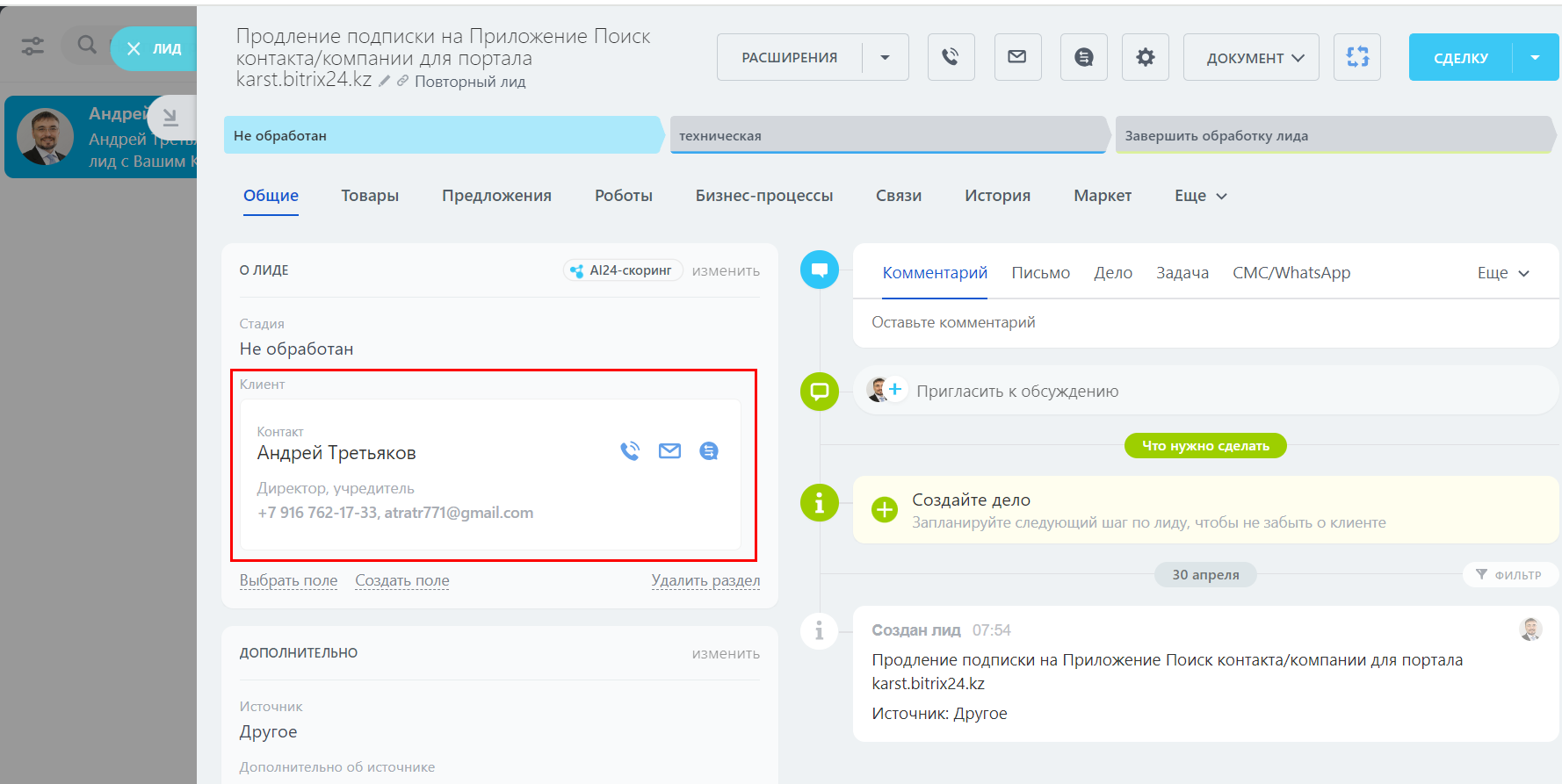 Приложение «Поиск Контакта/Компании для Лида» осуществляет поиск по базе CRM заведенных ранее Контактов и Компаний с телефонами и электронной почтой, указанными в Лиде. Если такой Контакт или Компания найдены – они указывается в карточке Лида, и Вы точно знаете, кто именно обратился к Вам.