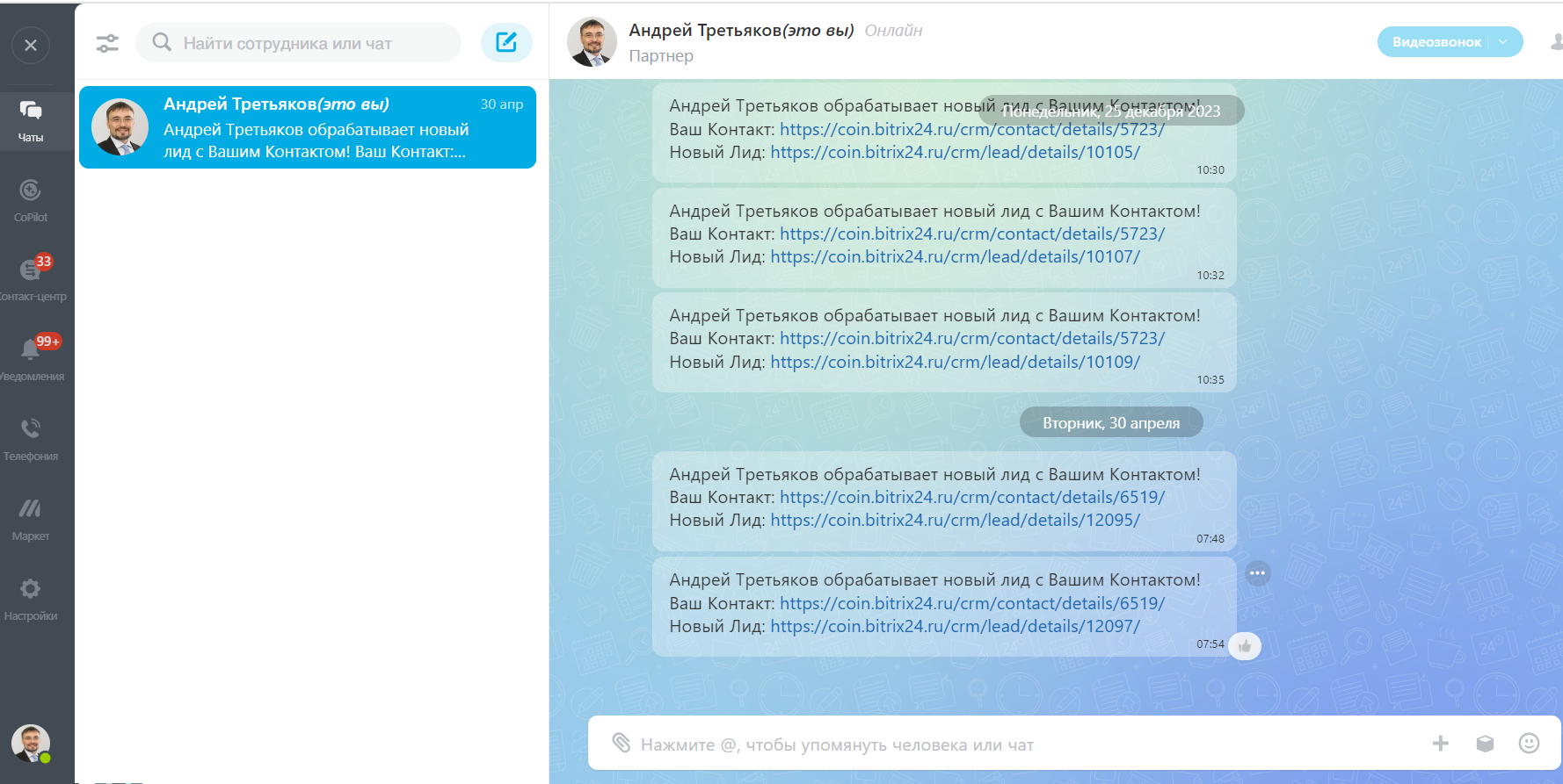 Уведомить Ответственного за найденную Компанию или Контакт о новом Лиде.