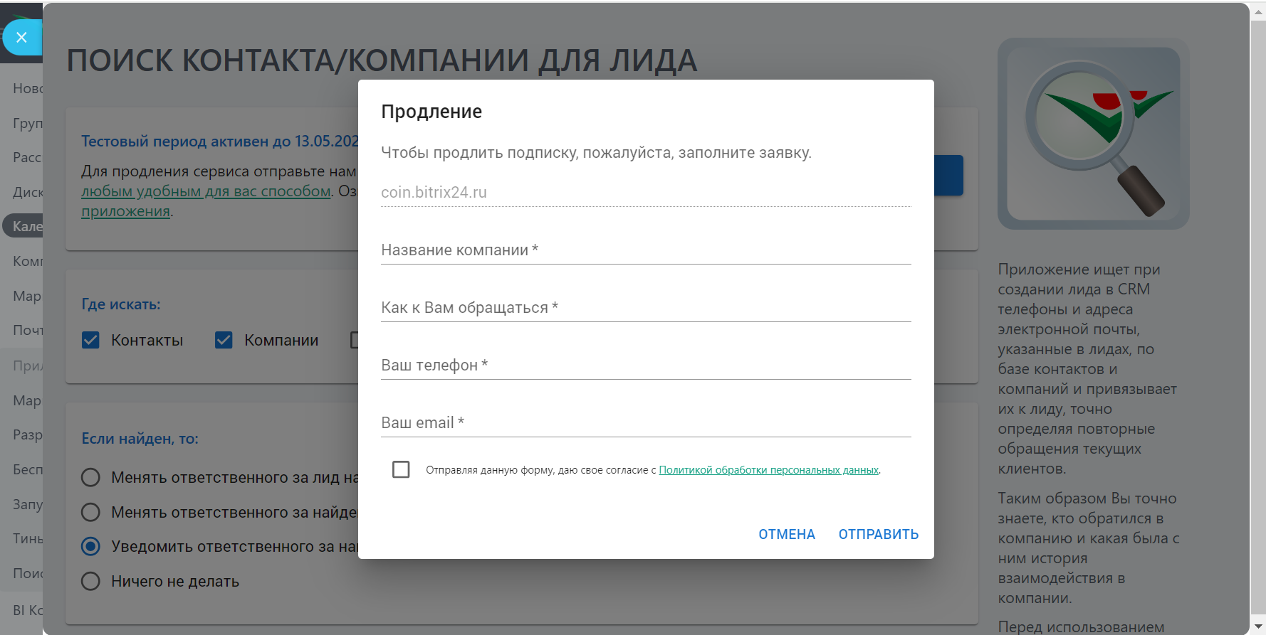 Поиск и изменение Контактов и Компаний в базе CRM проводится только среди Контактов и Компаний, доступных установившему приложение работнику в соответствии с правами пользователя. Учитывайте эту особенность при работе приложения.