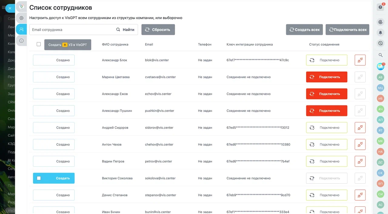 Также создать можно в личном кабинете https://gpt.vis.center/p/employees, а затем произвести подключение из приложения.