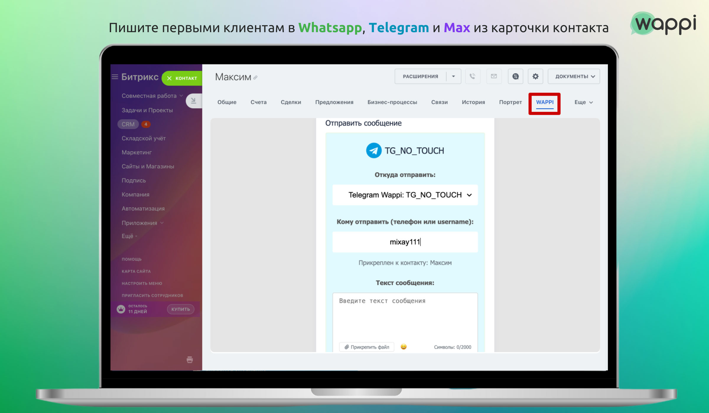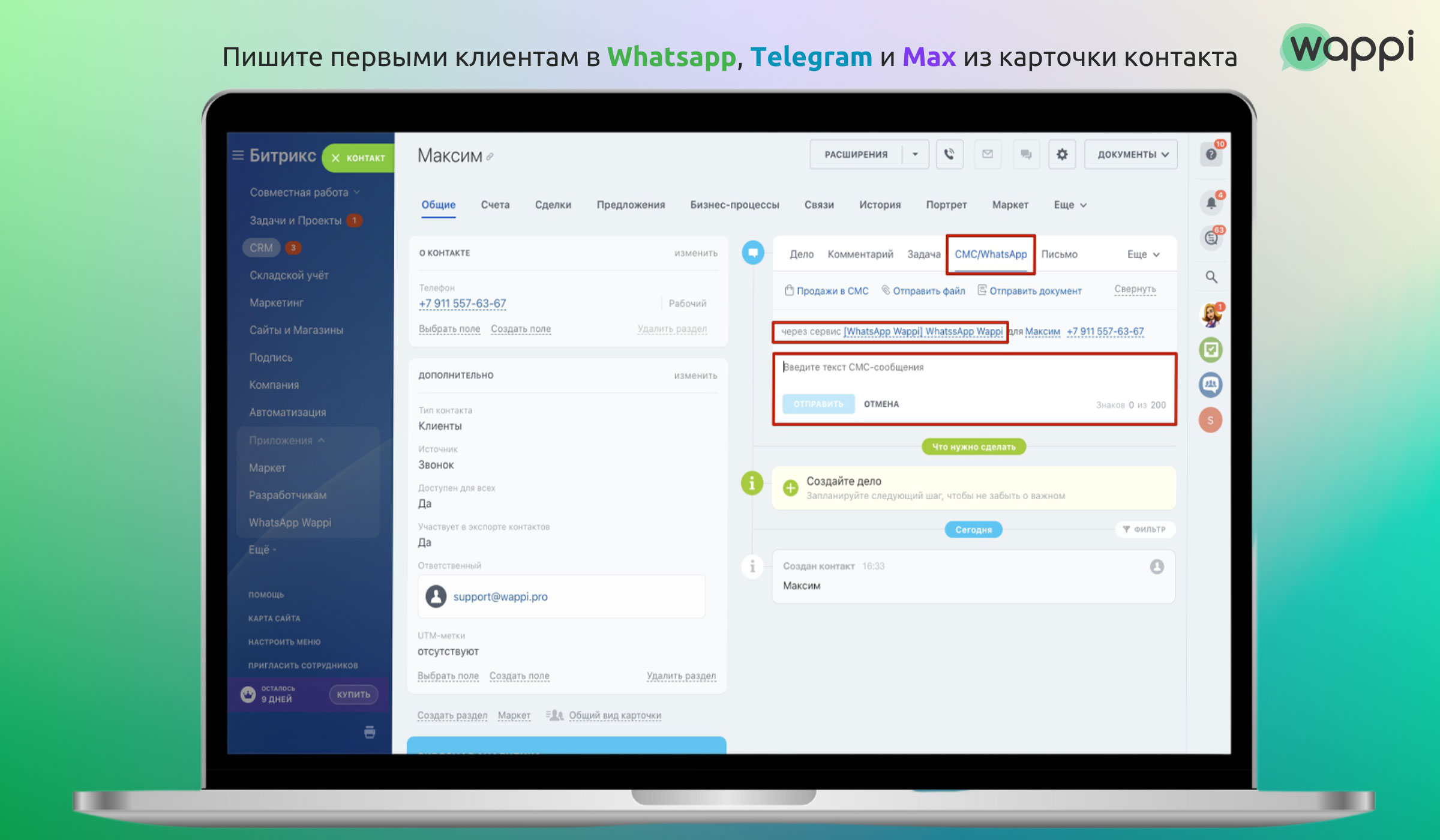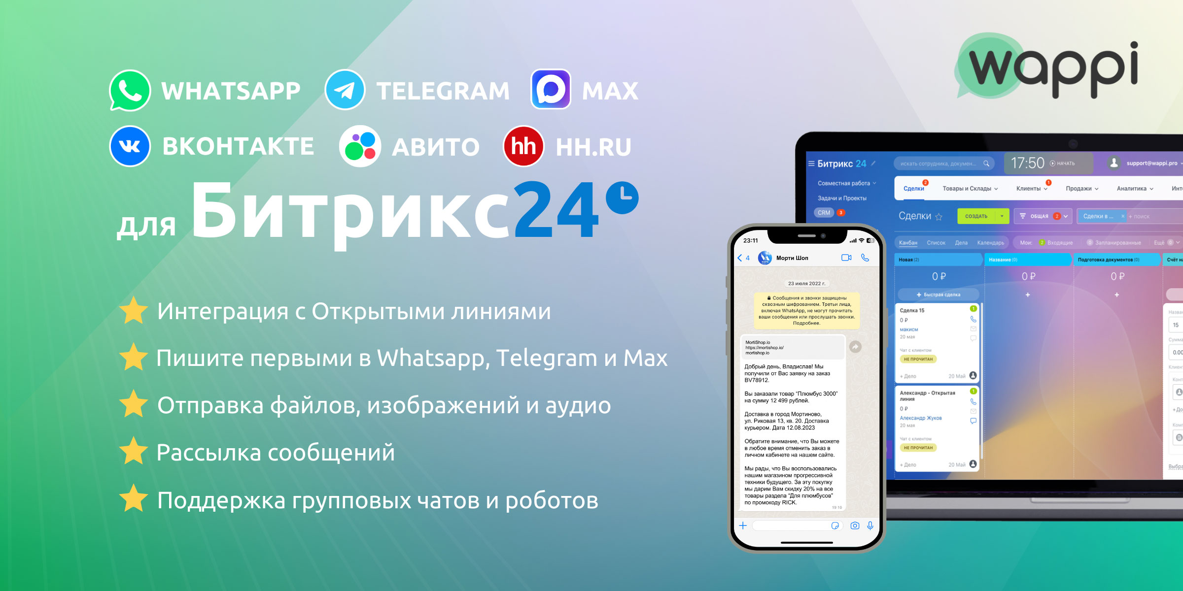 Wappi - это удобная и простая интеграция Whatsapp, Telegram, Max, Авито, HH и ВКонтакте с Битрикс24. Теперь вы можете общаться с клиентами напрямую из CRM, используя популярный мессенджер. Подключение занимает всего 5 минут, без необходимости привлекать разработчиков или выполнять сложные настройки. Просто зарегистрируйтесь в Wappi и получите 5-дневный бесплатный период для ознакомления с сервисом!