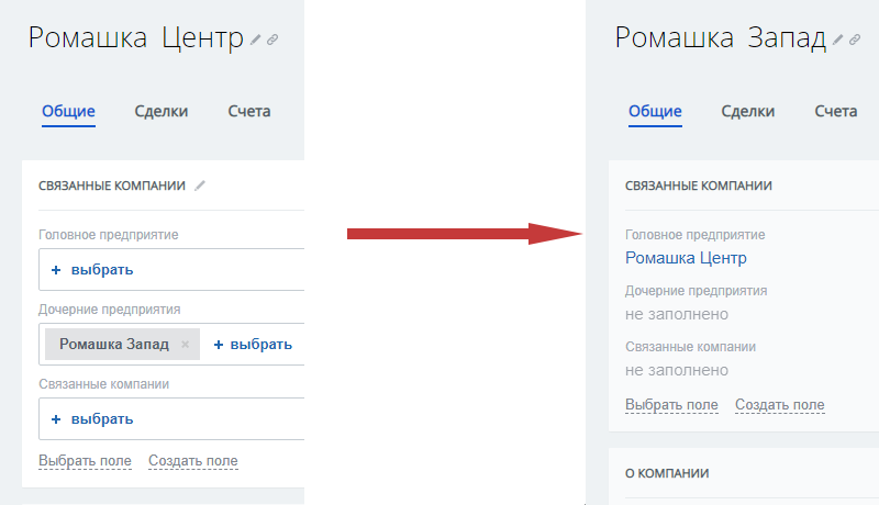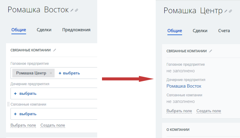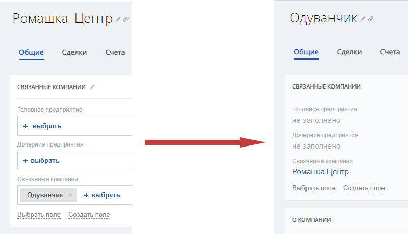 Поле "Связанные компании" (множественное): у выбранных в данном поле компаний текущая компания автоматически попадает в их поле "Связанные компании". Например: при выборе в карточке компании “Ромашка Центр” компании “Одуванчик” в поле “Связанные компании” после сохранения произойдет обновление компании “Одуванчик”, и в её поле “Связанные компании” добавится компания “Ромашка Центр”.
