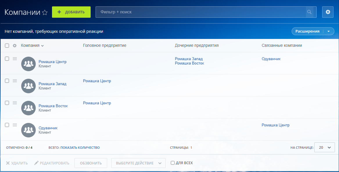 Поле "Дочерние предприятия" (множественное): в выбранных компаниях текущая компания автоматически встает в поле "Головное предприятие". Например: при указании в карточке компании "Ромашка Центр" компании "Ромашка Запад" как дочерней после сохранения произойдет обновление компании "Ромашка Запад", и в её поле "Головное предприятие" будет установлена компания "Ромашка Центр".