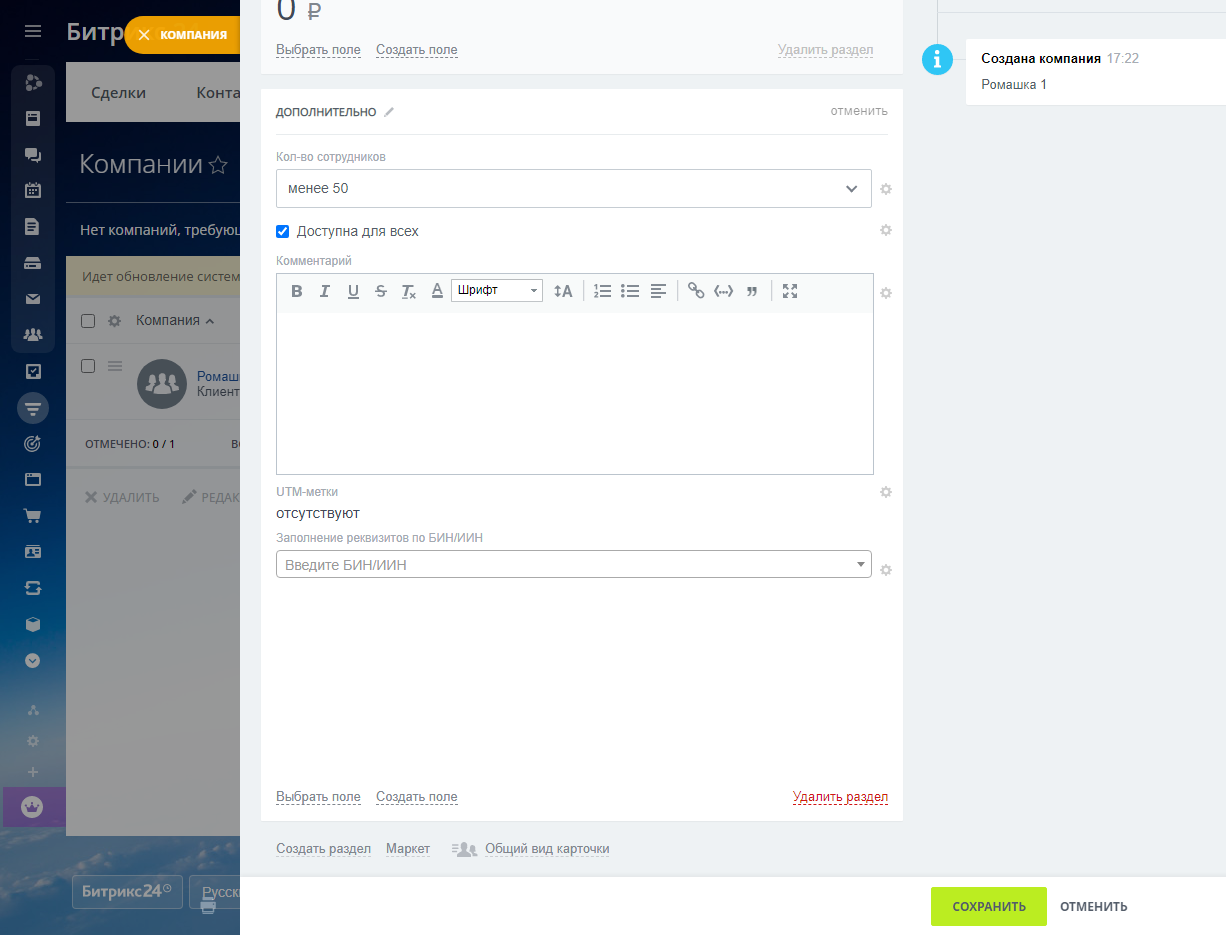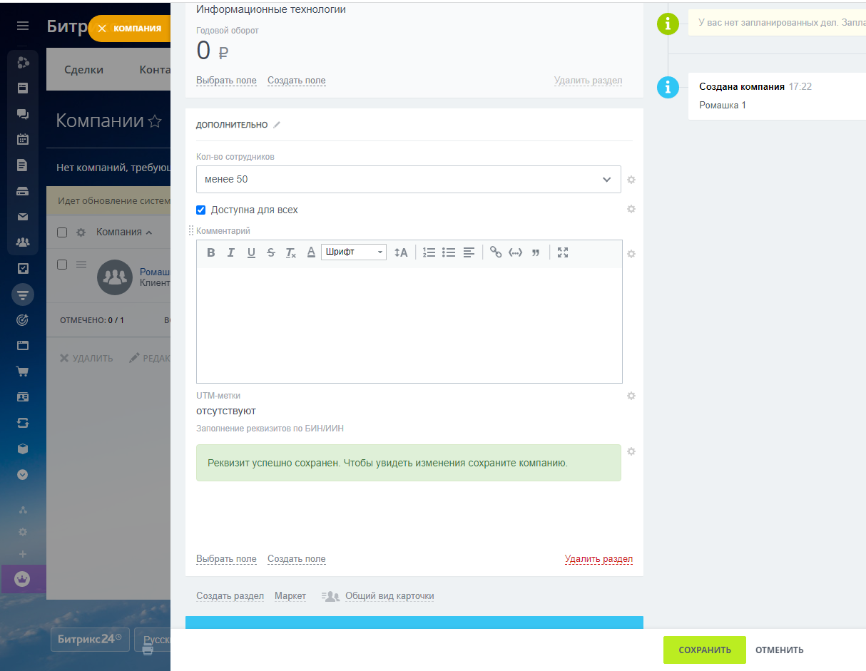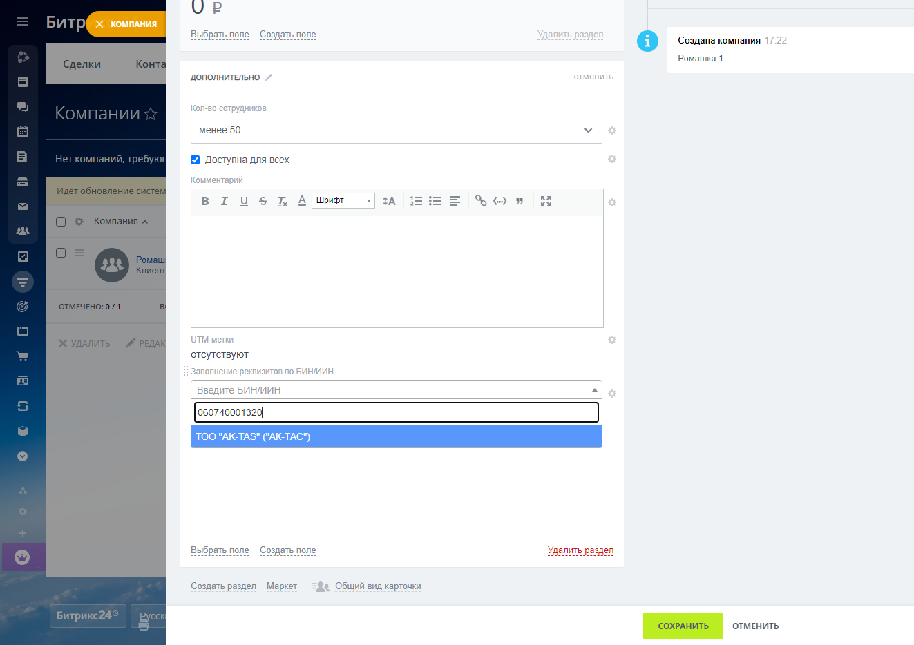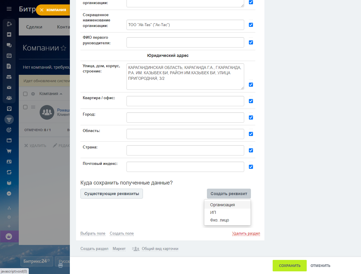 Для осуществления поиска необходимо открыть карточку компании, чьи реквизиты необходимо найти, и нажать «изменить». Далее введите в созданное приложением поле требуемый БИН или ИИН, по которому будет осуществлён поиск реквизитов компании. После того, как в списке появились реквизиты компании, вы можете решить, что сделаете с новыми реквизитами: создать новые реквизиты или объединить с уже имеющимися.