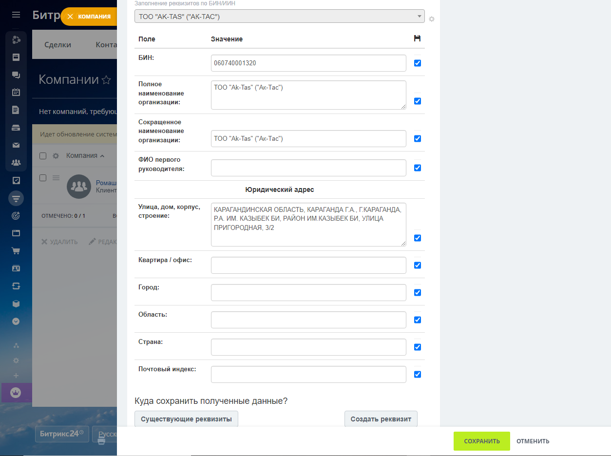 Таким образом, вы получаете возможность искать реквизиты компаний по БИН/ИИН, сохранять эти реквизиты или изменять уже имеющиеся.