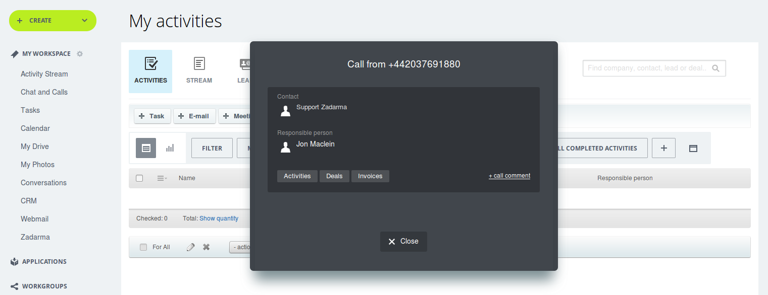 - Интеграция статистики звонков и записей разговоров. Прослушивайте записи разговоров прямо из Битрикс24.